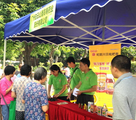 活動(dòng)期間,前來(lái)咨詢潘高壽四大產(chǎn)品(蛇膽川貝枇杷膏、蜜煉川貝枇杷膏、治咳川貝枇杷露、蛇膽川貝液)功能主治、用法用量及注意事項(xiàng)的群眾絡(luò)繹不絕,熱情高漲。白云山潘高壽藥業(yè)工作人員耐心作了解答,并向市民贈(zèng)送產(chǎn)品潘高壽川貝枇杷糖及潘高壽潤(rùn)喉糖,得到市民群眾的一致好評(píng),贊不絕口。