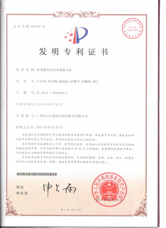 近日,白云山潘高壽藥業的發明“抗霧霾飲料及其制備方法”獲國家發明專利授權。至今,白云山潘高壽藥業已擁有國家發明專利15項。